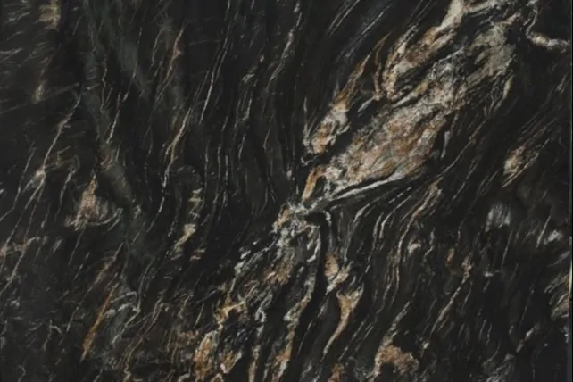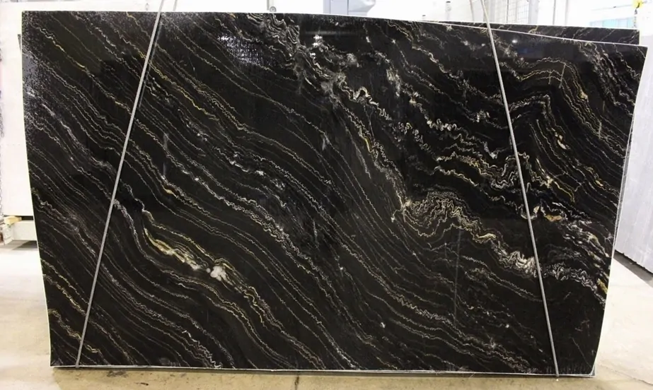 Belvedere kvartsit är en exklusiv natursten med mörk bakgrund och kraftfull vit ådring. Den polerade ytan framhäver stenens naturliga djup och karaktär.