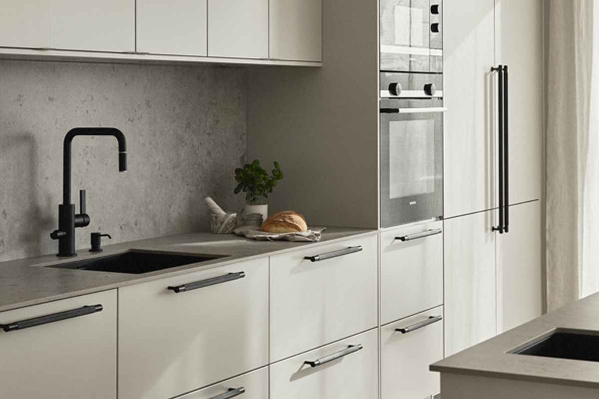 Den ljusgrå färgen fungerar som en neutral bas i köket och gör det enkelt att kombinera bänkskivan med olika material och färger.