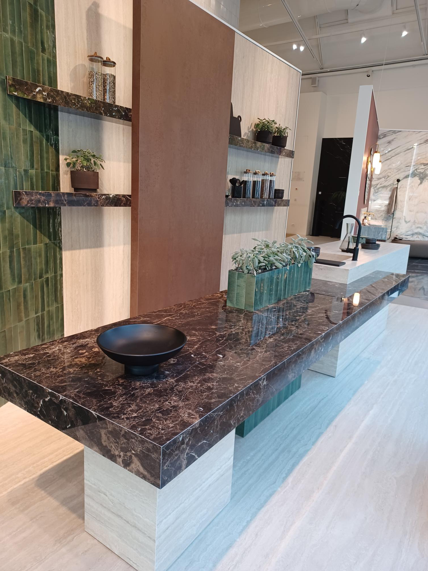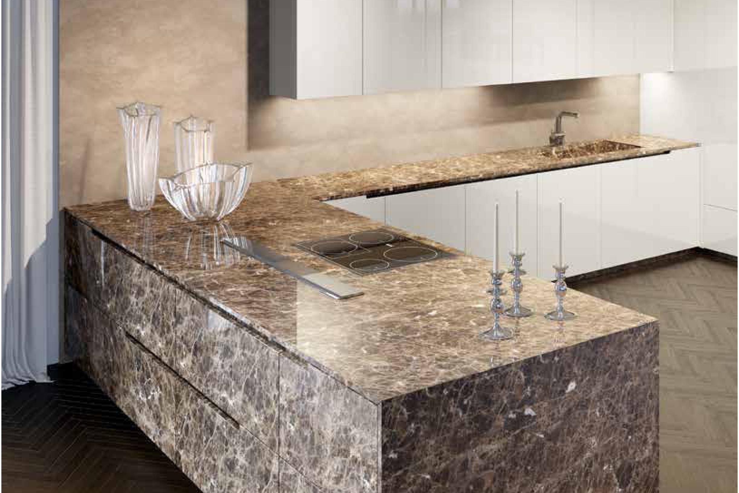 Marazzi Emperador är en keramisk bänkskiva inspirerad av klassisk brun Emperador-marmor. Den polerade ytan framhäver stenens värme och djup.